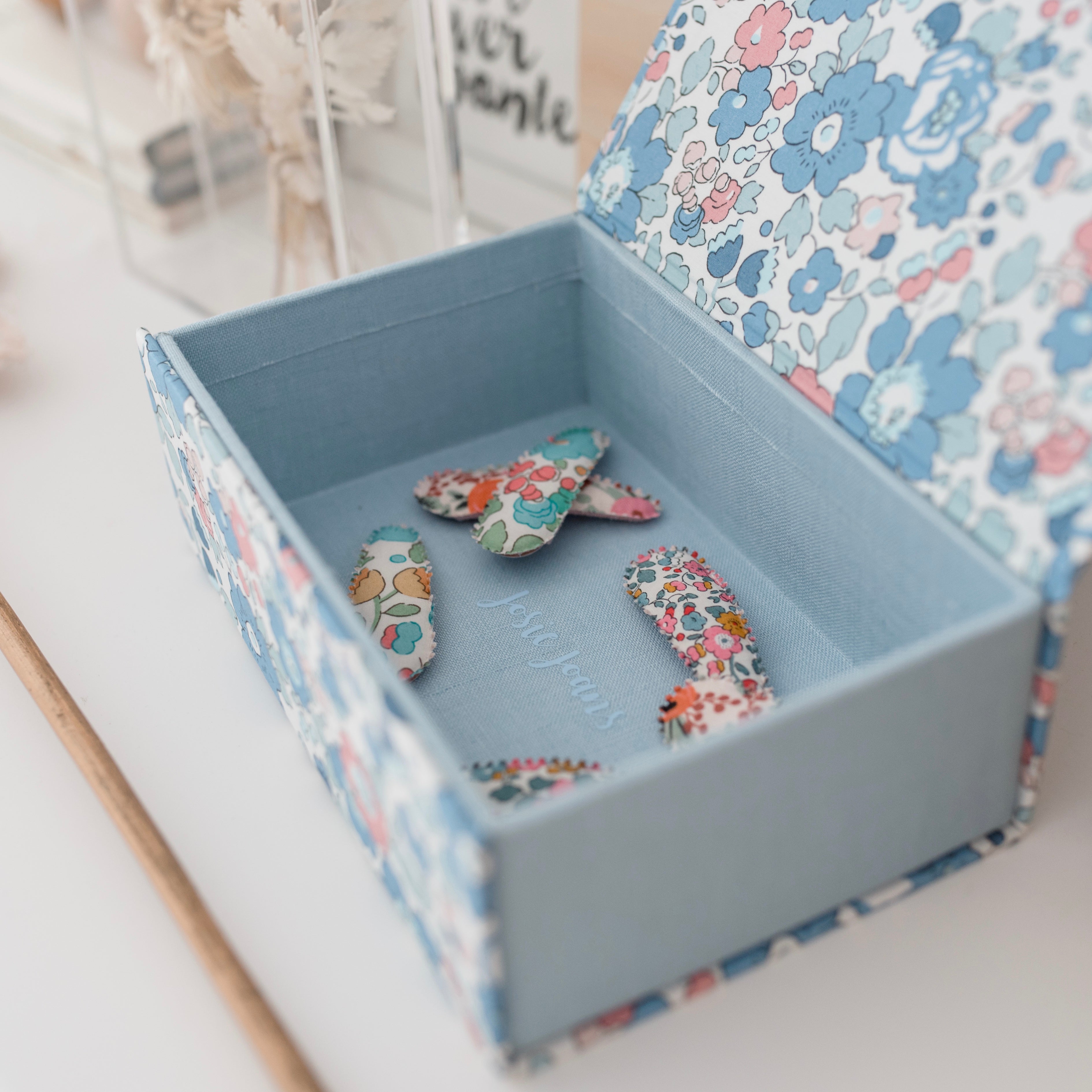 Created using Liberty London fabric, this compact magnetic keepsake box is the perfect place to store all your Josie Joan's pretties.
