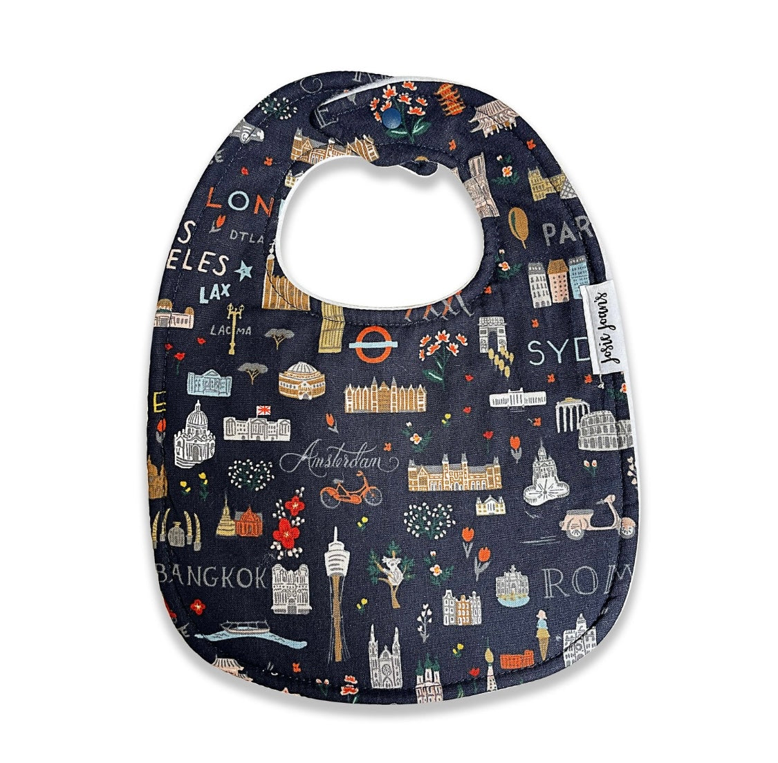 The bibs are fastened with baby friendly snap buttons .